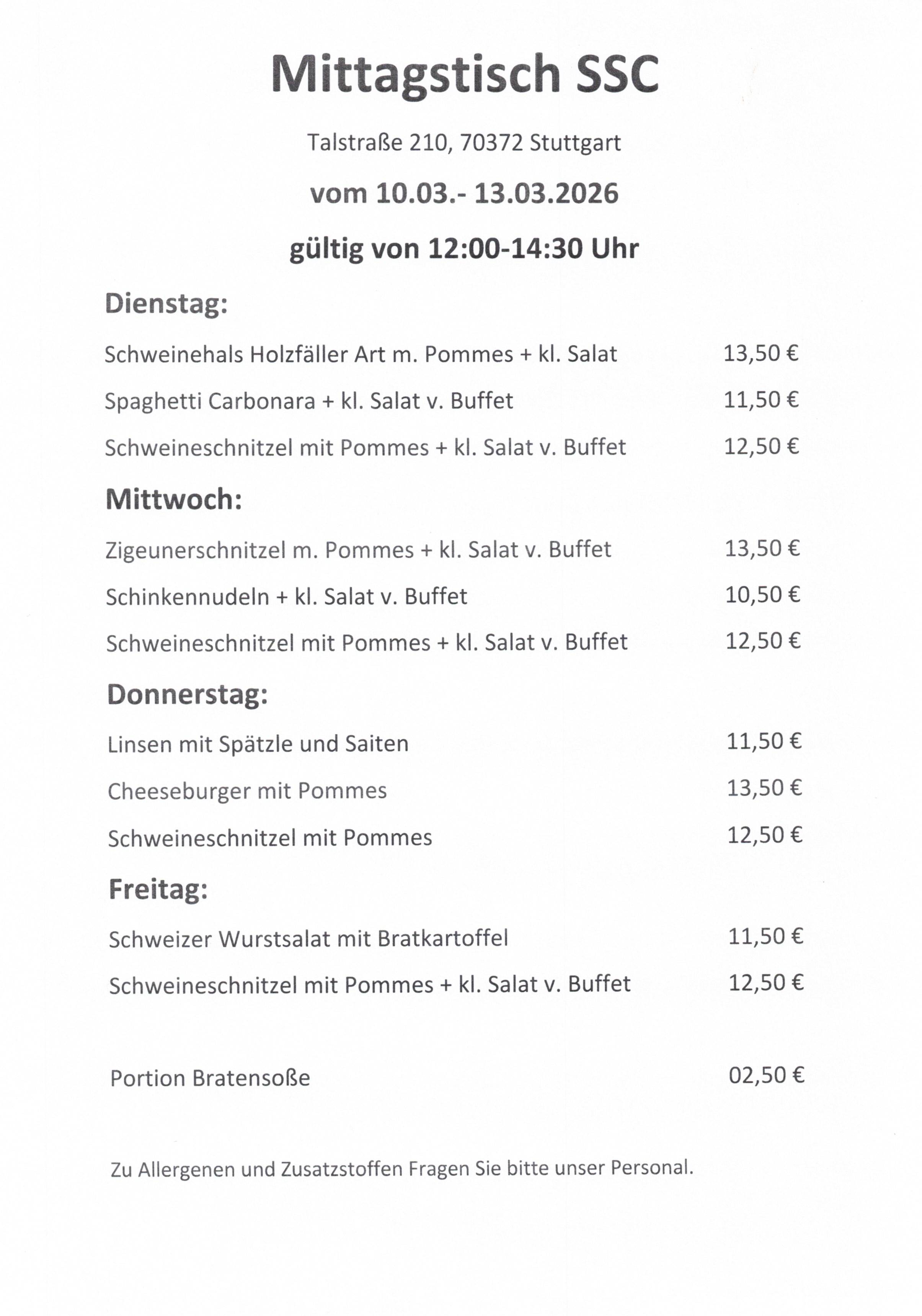 während der Wasen-Zeiten ist die Zufahrt in der Talstraße zum SSC zeitweise abgesperrt. Bitte weisen Sie am Absperrpunkt die Sicherheitskräfte darauf hin, dass Sie zum SSC (Stuttgarter Sportclub, Talstr. 210) möchten — die Ordner lassen Sie dann passieren. Vielen Dank und bis bald!